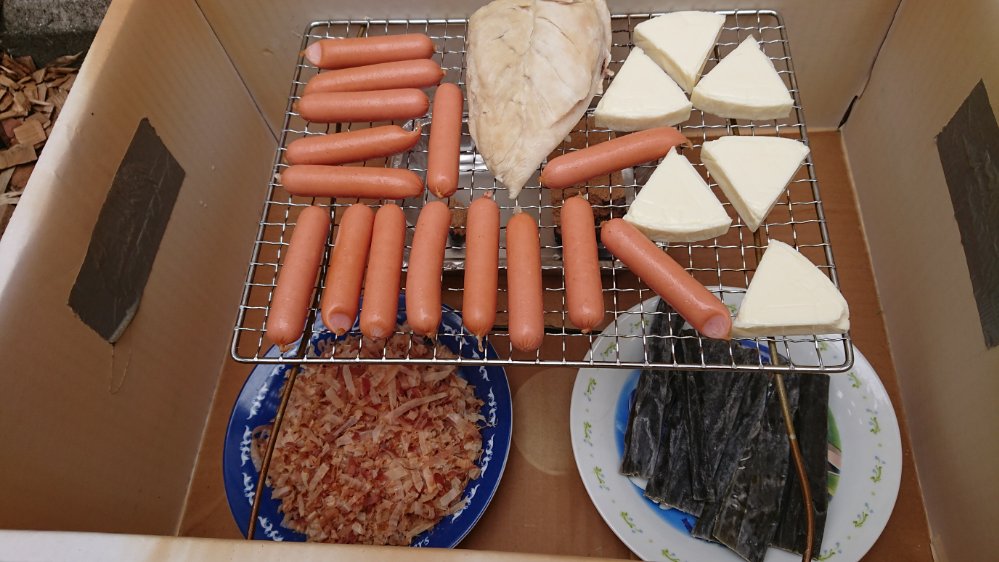 網の上に載ってる、ウィンナー、チーズ、鶏肉は僕が好きなものなのでこれは置いといて、今回の目的は鰹節と昆布に薫香をつけること!!