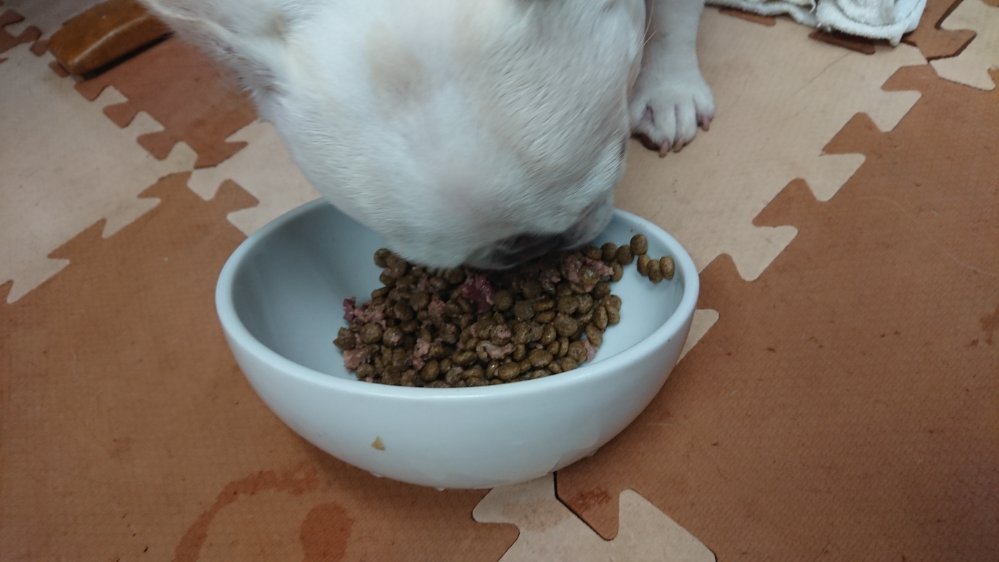 モコは缶詰を混ぜて、缶詰のみをきれいになめとってます!