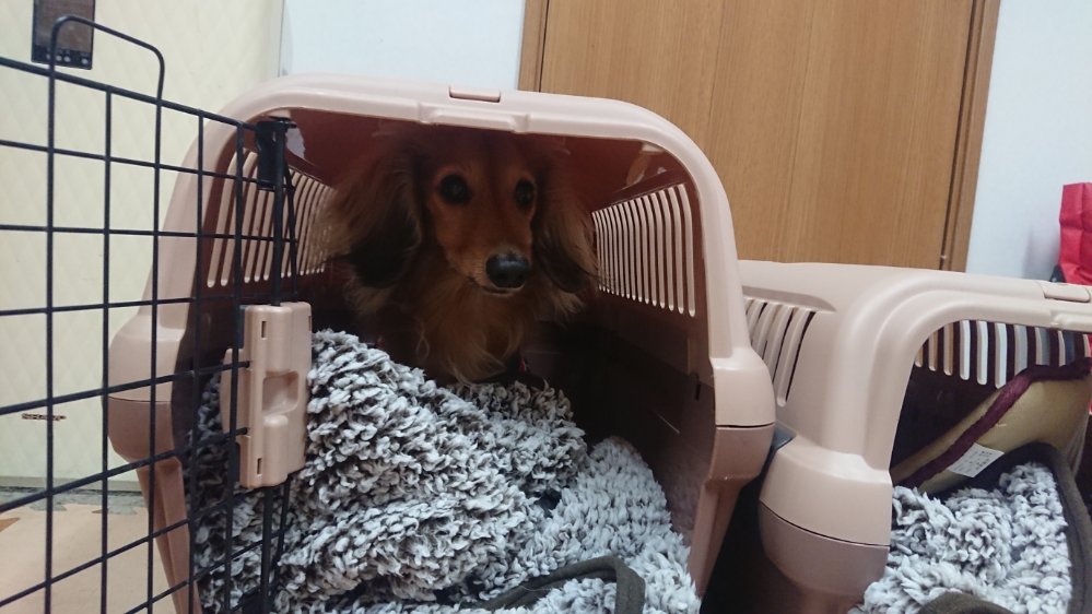 晩御飯がおわり、膝はどこや!!と探すあんと、やっぱり落ち着くのかケージで休むれん😀