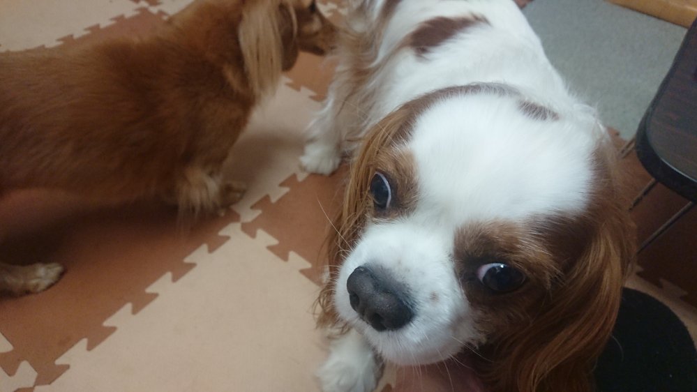 メルは小太郎にちょっかい出して、小太郎は嗅がれてる!という顔を😁