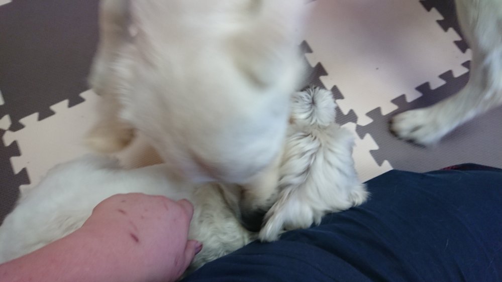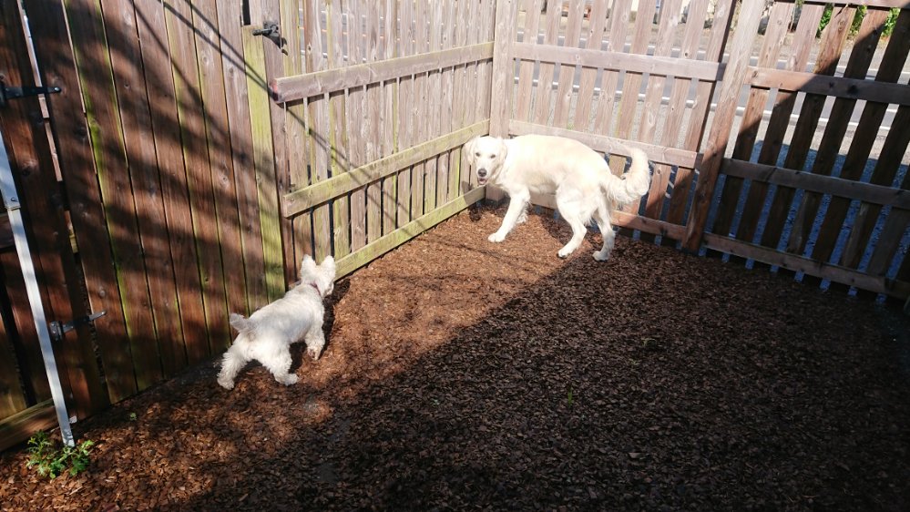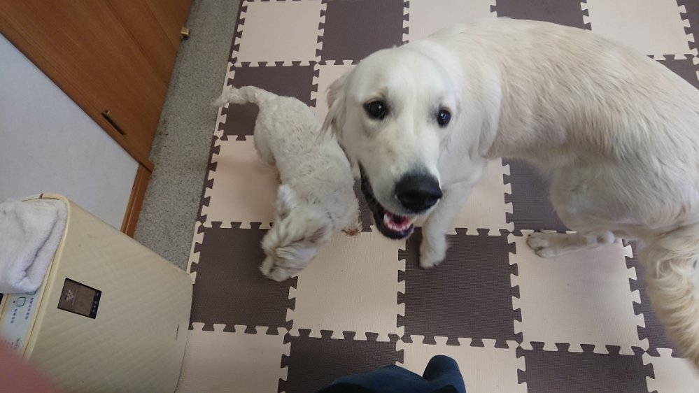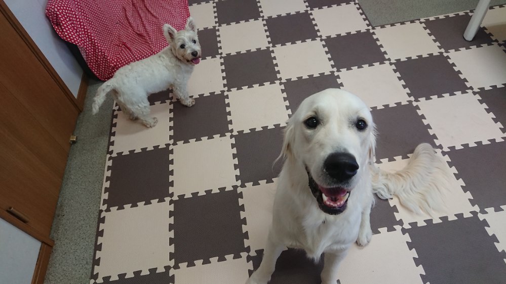 今日は久しぶりに一時預りですが、ゴールデンのまーる君とウェスティのこむぎちゃんが来ました😀