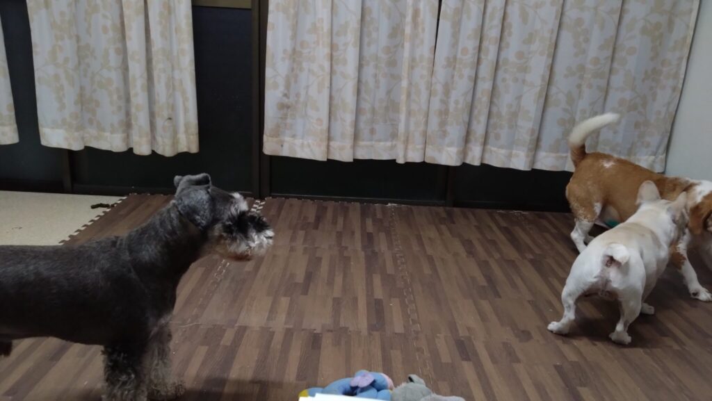 ライリーはひょっこり覗いてくる感じだけど中では一緒に遊んでる福とハクの遊びを見ながら地団駄😁