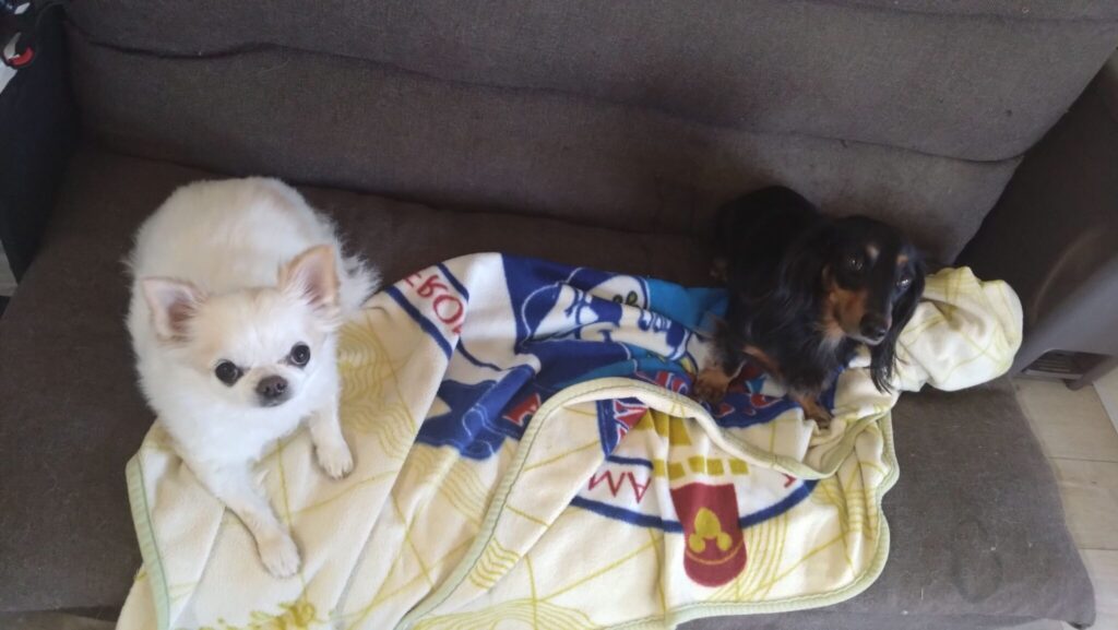 ミルク、マロン、こてつがソファーでゆったり